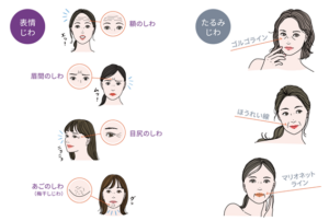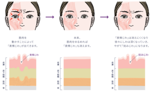 笑ったり、しかめ面をしたときなどに見られる目尻のシワ、眉間のシワ、額の横シワなどの表情を作った際に見られるシワは「表情ジワ」と呼ばれます。これは筋肉が収縮(縮む)することで皮膚が深部に引き込まれて溝が作られることでシワが形成されます。若いうちは皮膚の弾力が保たれているため、表情を作ったときのみに表情ジワが見られるだけで、普段はシワは見られません。しかし、老化や紫外線によりコラーゲンやエラスチンといった皮膚の弾力に関わる成分が減って弾力性が低下した状態で、同じ部分に表情ジワが繰り返し作られると、シワが元に戻りにくくなり深く刻まれるようになります。